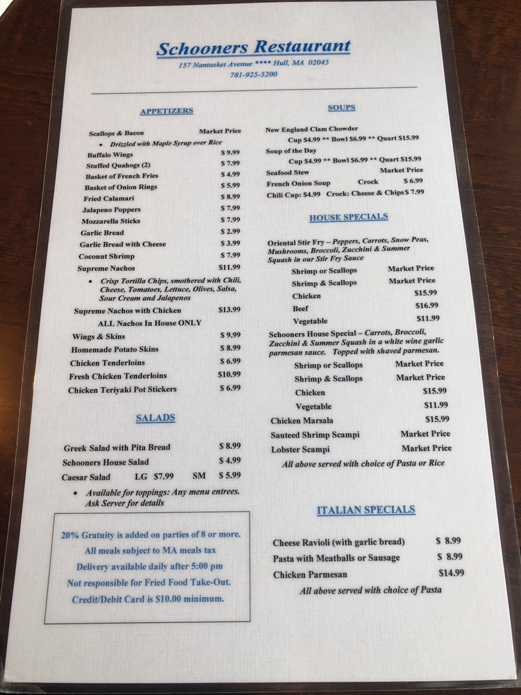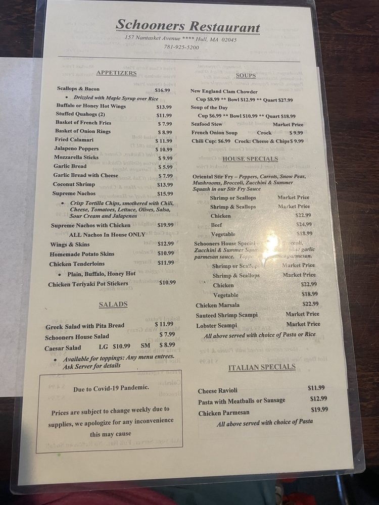 Nestled at 157 Nantasket Ave in Hull, MA, Schooner's Restaurant is a beloved seafood haven that seamlessly blends casual dining with exceptional flavors. Renowned for its clam chowder, hailed as the best on the East Coast, Schooner's offers a range of dishes that cater to every palate, including vegetarian options and classic comfort foods like French onion soup and juicy burgers.